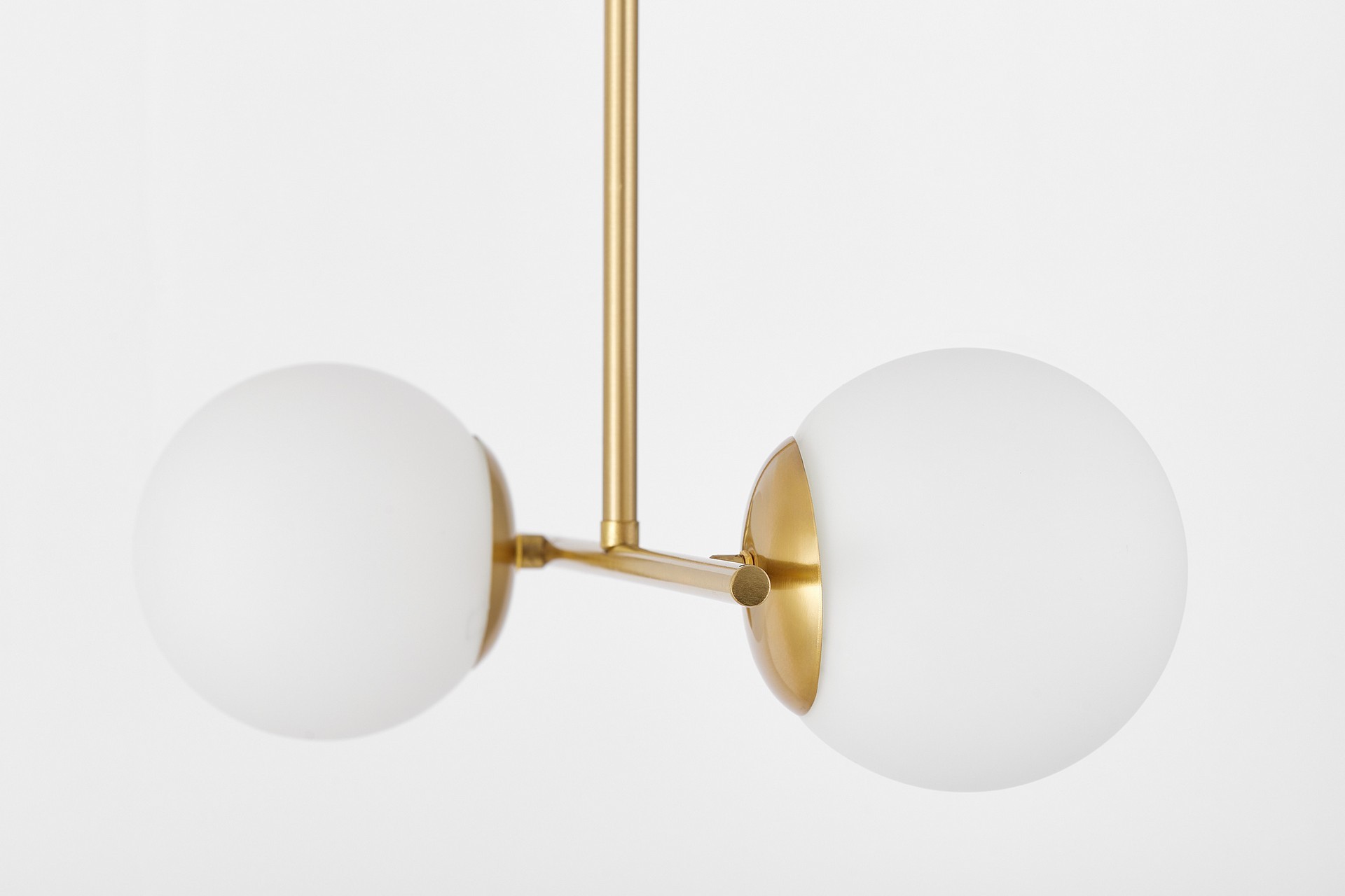 Questa configurazione a doppio punto luce garantisce una distribuzione luminosa equilibrata, ideale per creare ambienti accoglienti senza zone d’ombra. Le sfere dal diametro di 13 cm filtrano la luce con eleganza, rendendo la lampada a sfera da soffitto in ottone una scelta raffinata per chi desidera un’illuminazione discreta ma d’impatto.