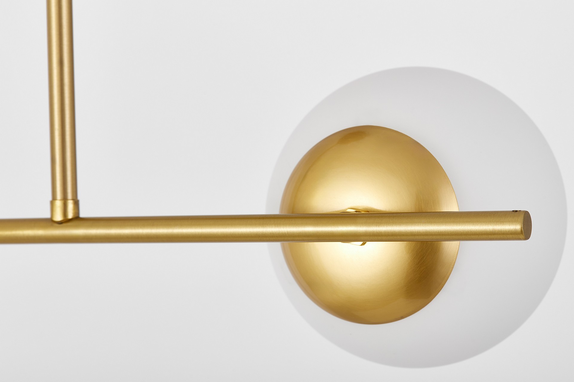 La lampada per soffitto ottone LEDO W2 è caratterizzata da una barra orizzontale in metallo con finitura ottone, leggermente inclinata per creare un effetto dinamico e contemporaneo. Le due sfere in vetro opaco, posizionate alle estremità opposte, contribuiscono a diffondere la luce in modo uniforme e delicato.