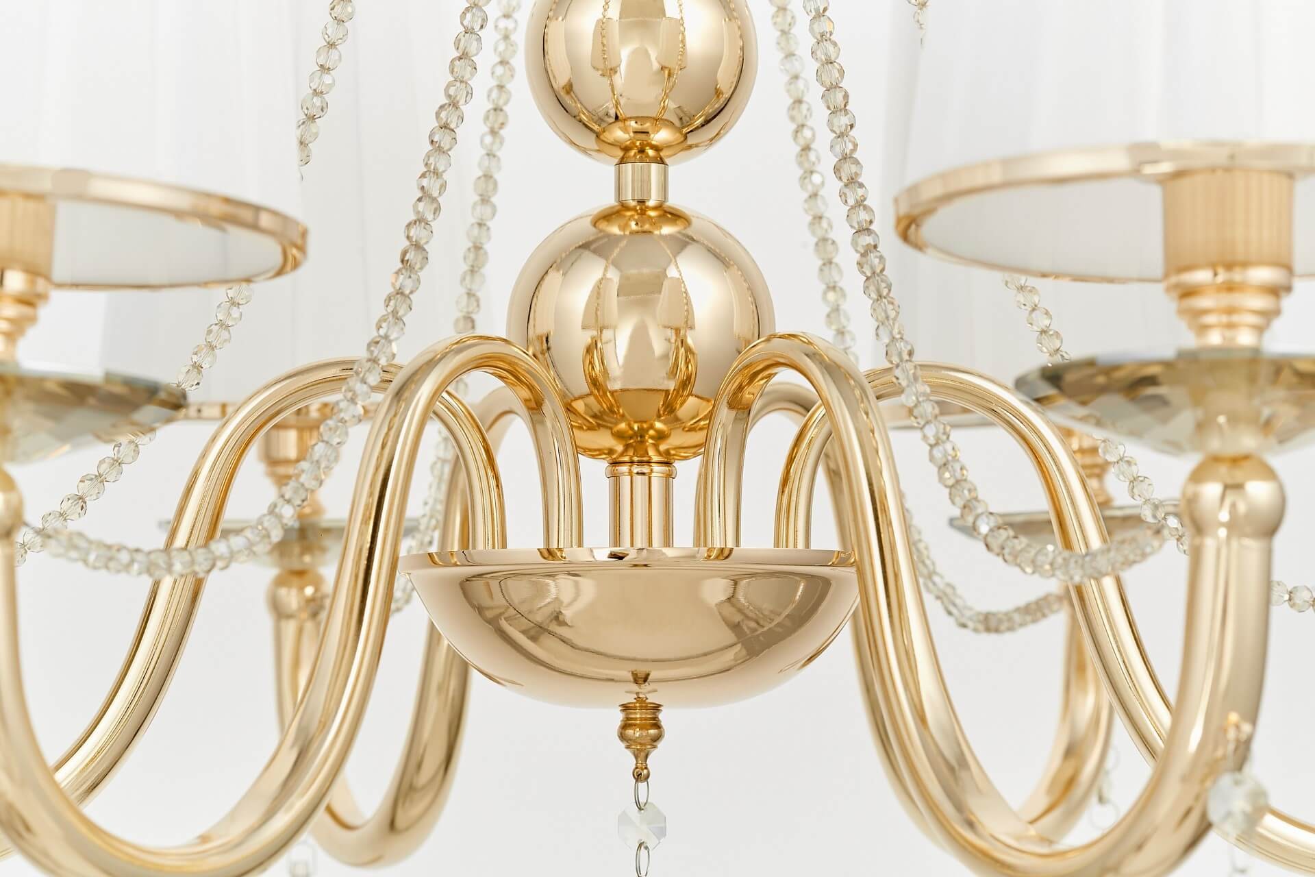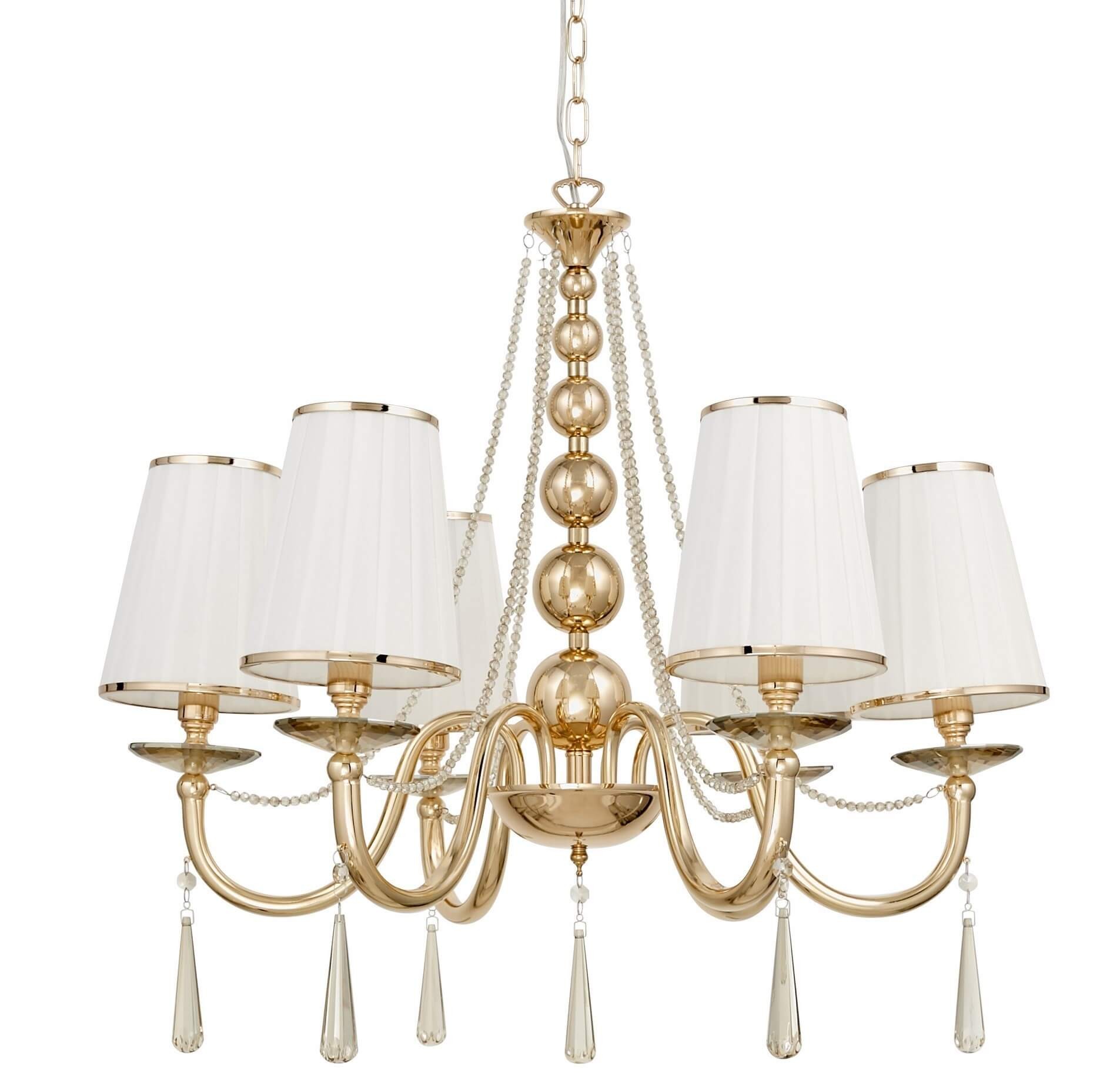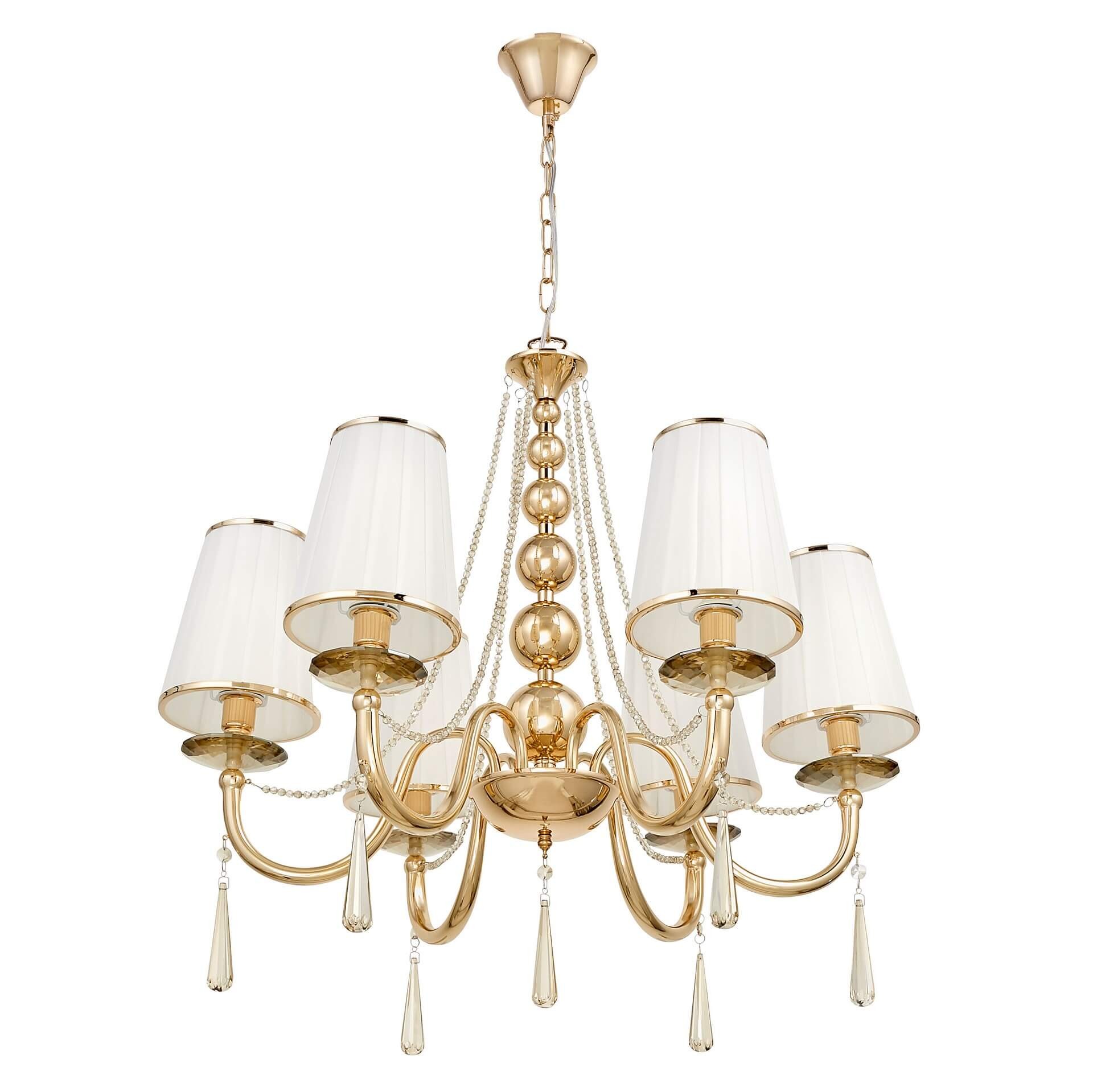Lampadario classico oro dalla forma elegante e raffinata. FABIONE W6 è una lampada classica a sospensione con la struttura in metallo dorata riccamente decorata da cristalli di forme diverse, come gocce e pendenti piramidali. 6 bracci dalla forma morbida sorreggono i paralumi in tessuto color plissettato color crema.