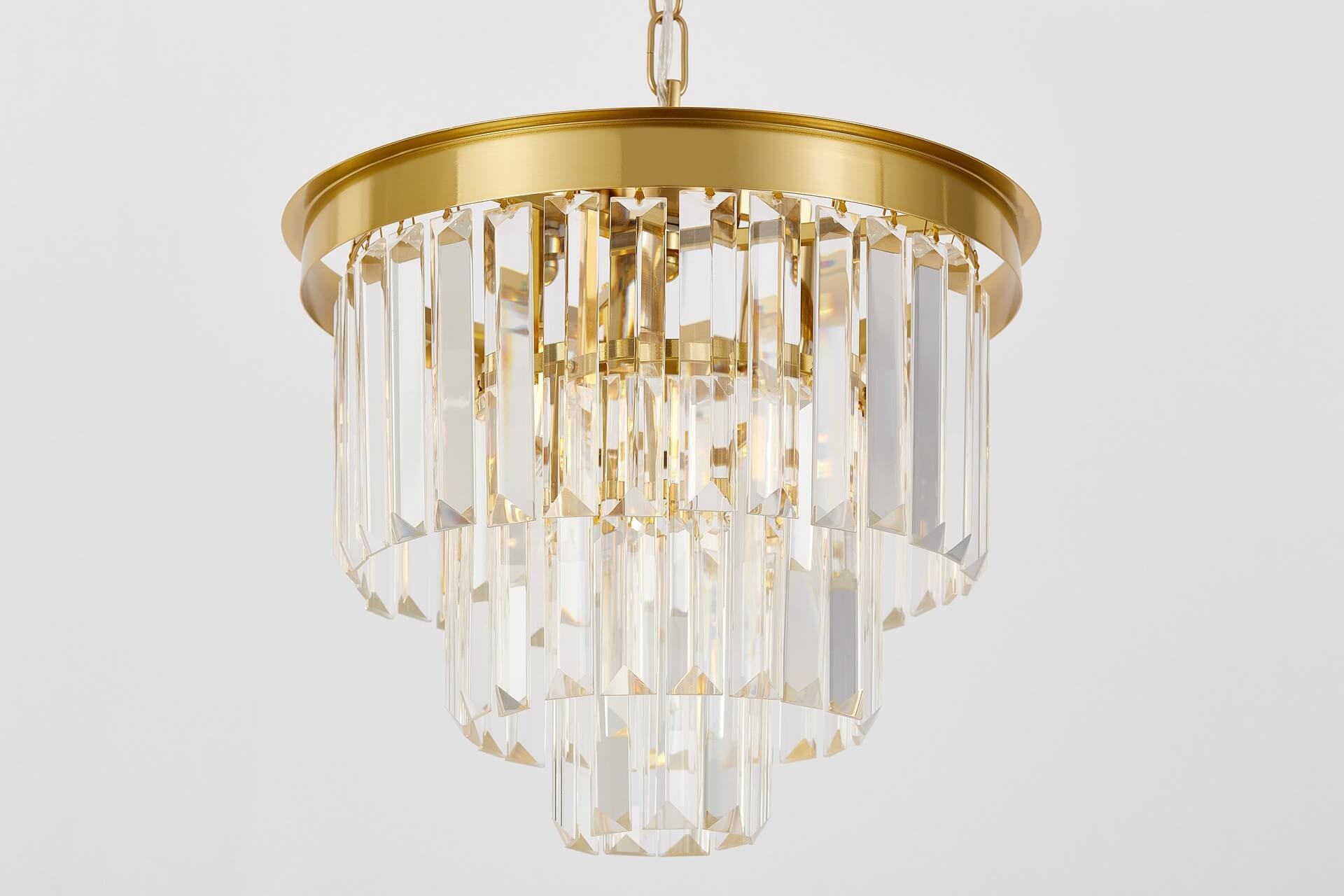 La finitura in ottone dorato dona calore visivo e raffinatezza, mentre la disposizione multilivello dei cristalli genera riflessi dinamici e luminosi. Il risultato è una luce soffusa e avvolgente, perfetta per creare atmosfere accoglienti e scenografiche.